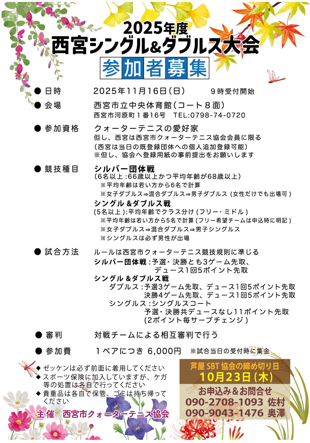 西宮シングル&ダブルス大会 (2025.11.16) 参加募集の案内です。