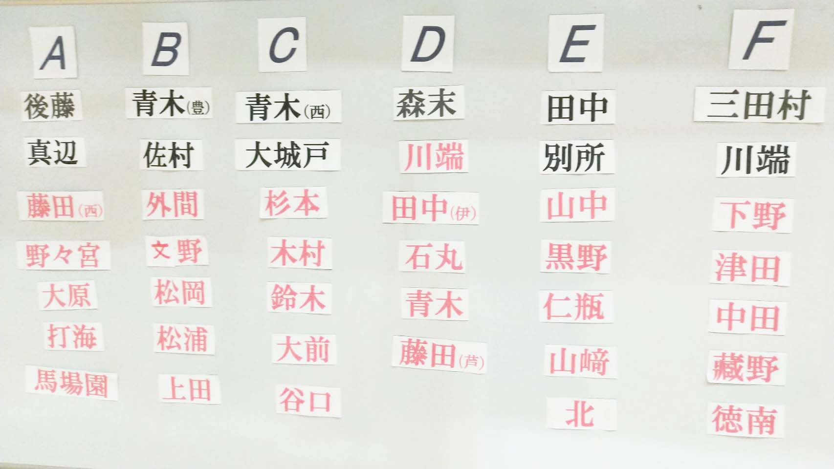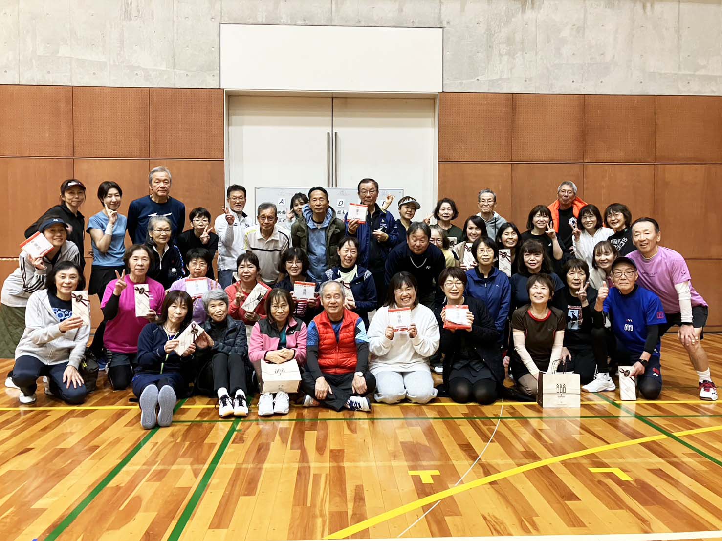 コート全6面を使い、総勢41名(当日1名欠席)の参加で6グループに分かれて、ゲーム自体は乱数表にて個々に戦い、負けた人が勝った人にコインを渡し、最終的にグループ分けしたメンバーの合計枚数で競いました。